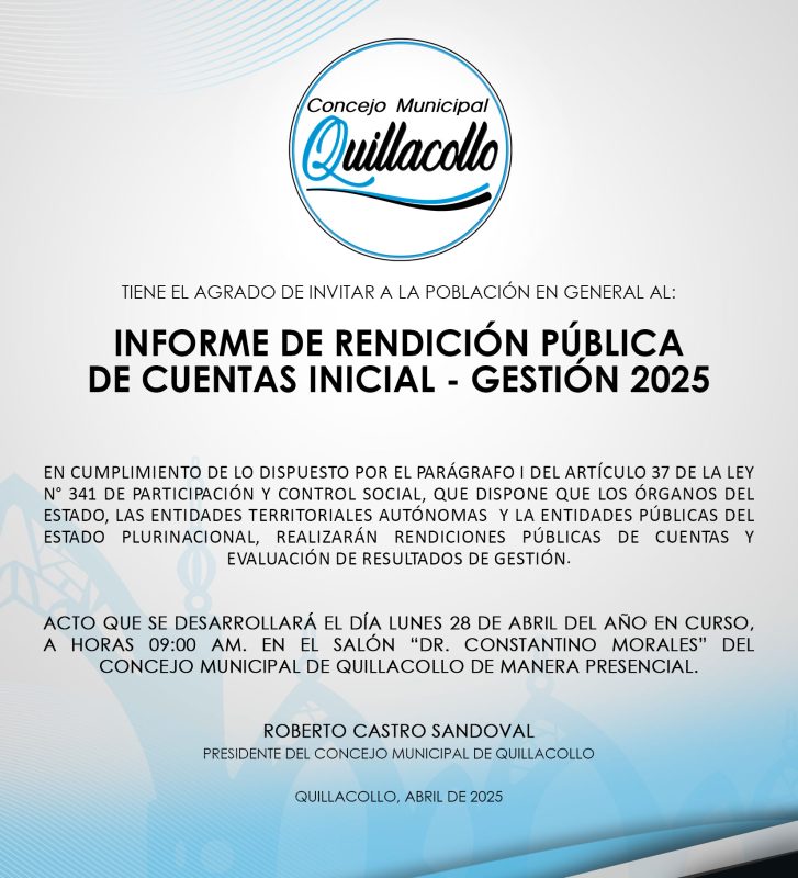 En cumplimiento de lo dispuesto por el parágrafo I del artículo 37 de la ley N° 341 de Participación y Control Social, que dispone que los órganos del estado, las entidades territoriales autónomas y la entidades públicas del estado plurinacional, realizarán rendiciones públicas de cuentas y evaluación de resultados de gestión.